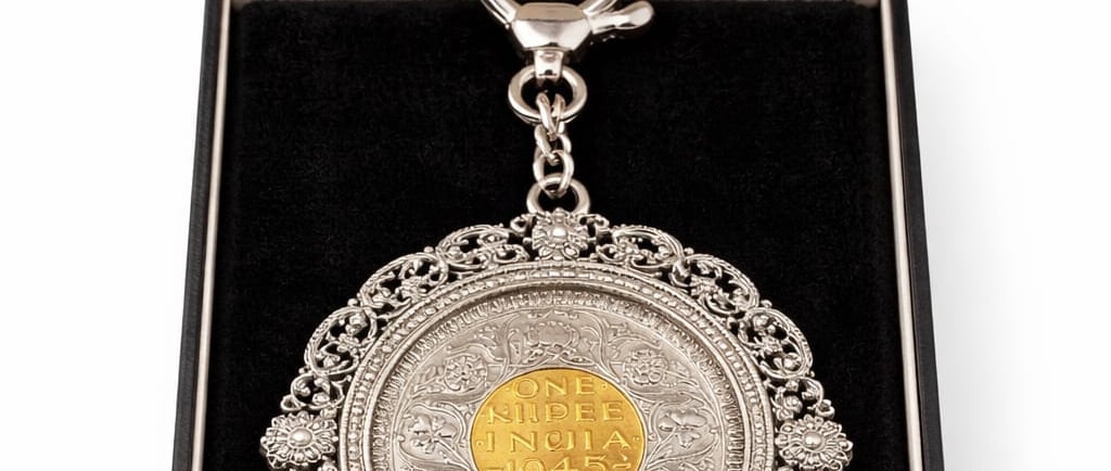 At the heart of the design lies a striking coin centerpiece, inspired by the classic “One Rupee India 1945.” The warm golden tone of the coin contrasts beautifully with the intricately carved silver frame, creating a balanced fusion of vintage charm and refined craftsmanship. Every swirl, floral accent, and delicate engraving around the border reflects a level of detail rarely seen in modern accessories.