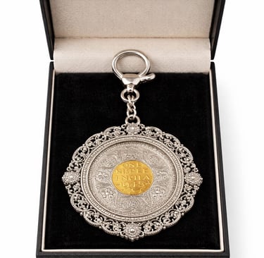 Featuring a beautifully preserved 1945 One Rupee coin at its heart, this piece is surrounded by intricate silver filigree work