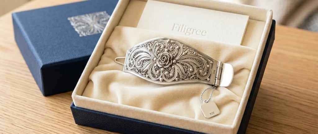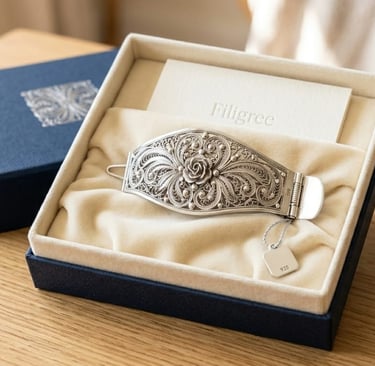 Made with 925 sterling silver, this barrette is not just beautiful, but also durable and designed to last. It comes in a beautiful navy blue box with a cream-colored velvet lining and a small silver tag that says 'FILIGREE'. The exquisite detail makes it a perfect choice for adding a touch of sophistication to any hairstyle, from a classic updo to a modern messy bun.